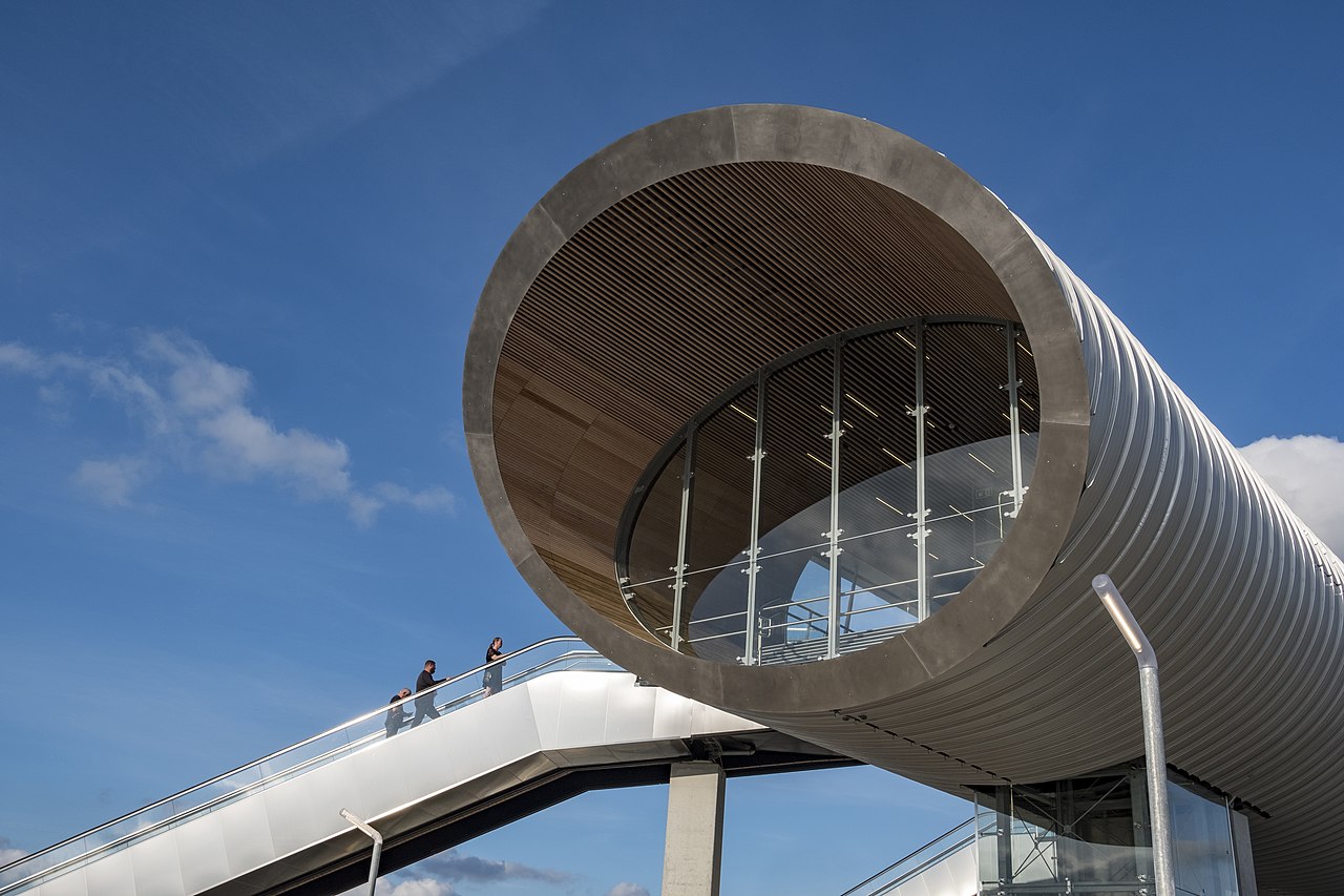 From the station’s platforms and the forecourts, slender combined stairway/escalators run up to the footbridge. With glass balustrades and a clever tapering profile at the top, these appear to float almost weightlessly, untethered to the footbridge’s main span. As well as stairs and escalators, the footbridge is served by lifts which are located directly underneath the footbridge’s main span rather than off to one side as is the more usual practice. The lift towers are made of glass, ensuring they do not detract from the surprisingly delicate appearance of the footbridge’s supports. They are integrated with the concrete piers supporting the footbridge, reducing visual clutter. The footbridge’s largest unsupported span is 58m, but the installation of two tuned mass dampers ensures the bridge feels solid for its users.