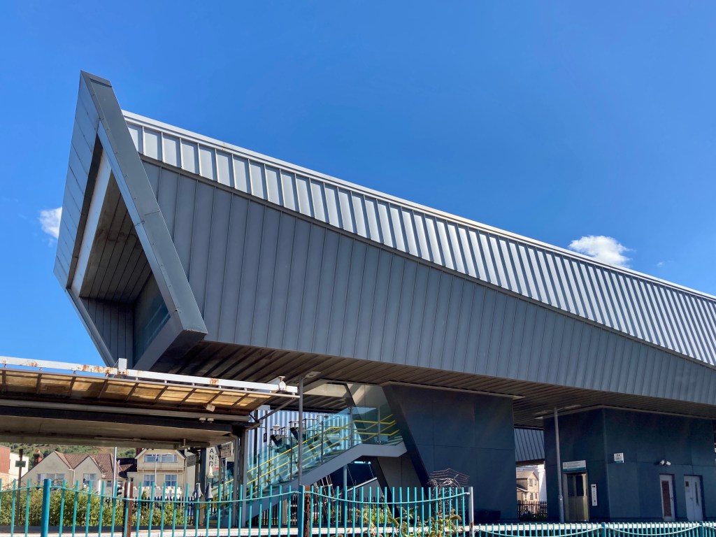 Looming above the station’s single island platform is one of the most dramatic new station buildings of the 2010s, the result of a rebuild that was completed in 2016. Taking cues from science fiction films and artwork there is something positively extraterrestrial about the building, with its spaceship-like (or perhaps space station-like) form.