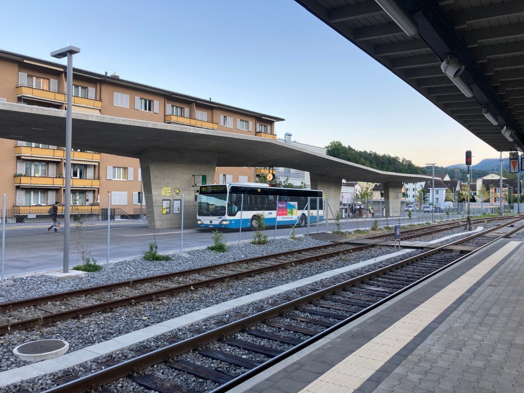 The concrete bus station and cycle park, as well as a payment building for car parking, were all built as part of a large scale reorganisation of transport facilities at Adliswil to make a new transport hub, completed in 2022.