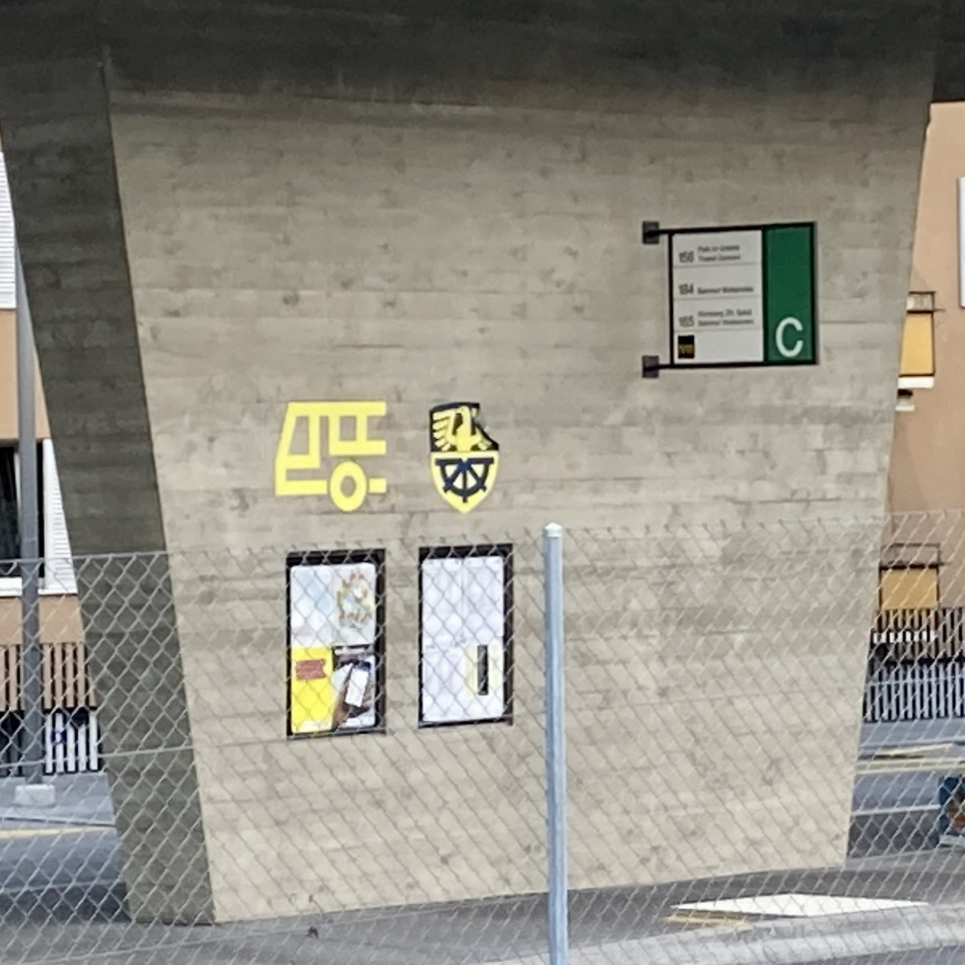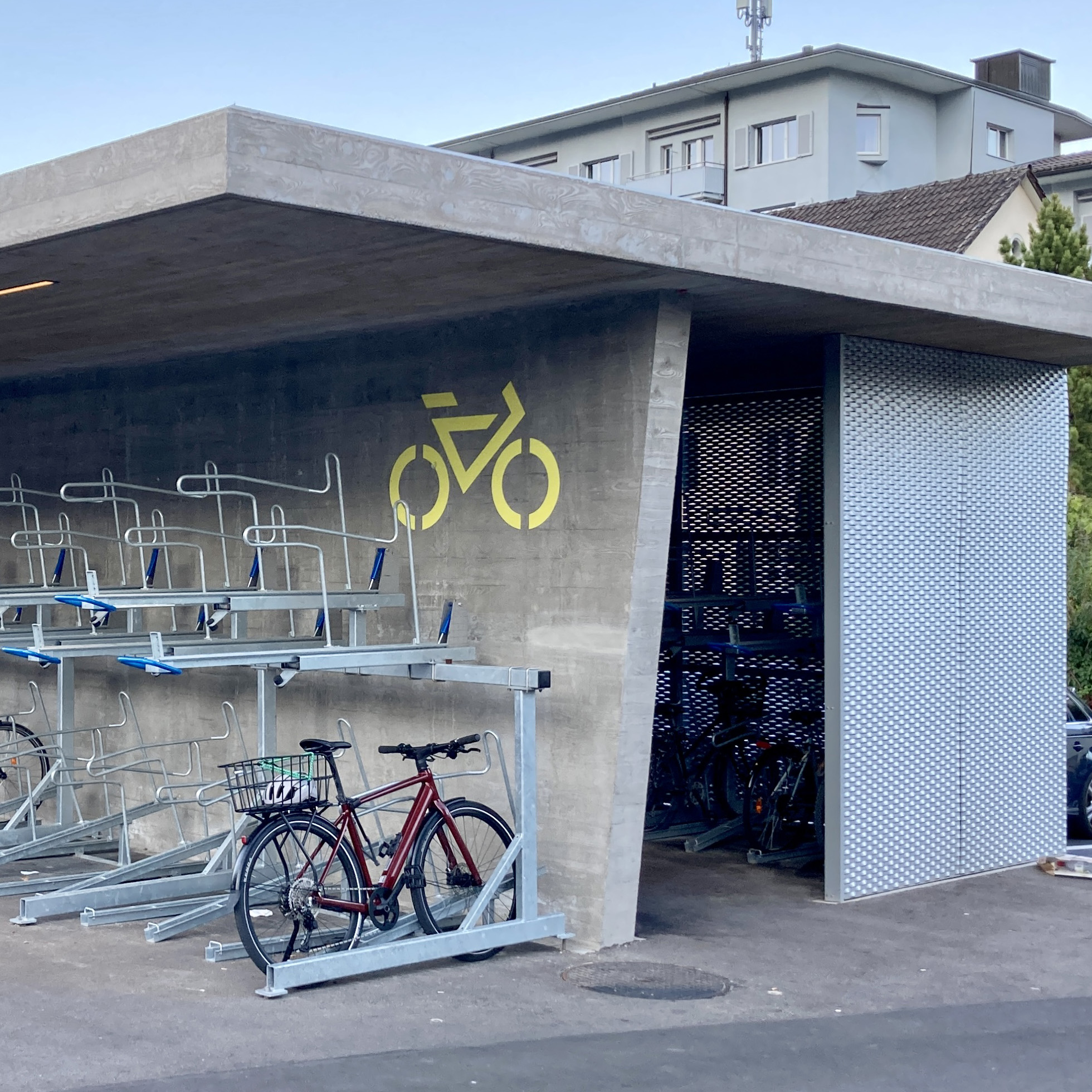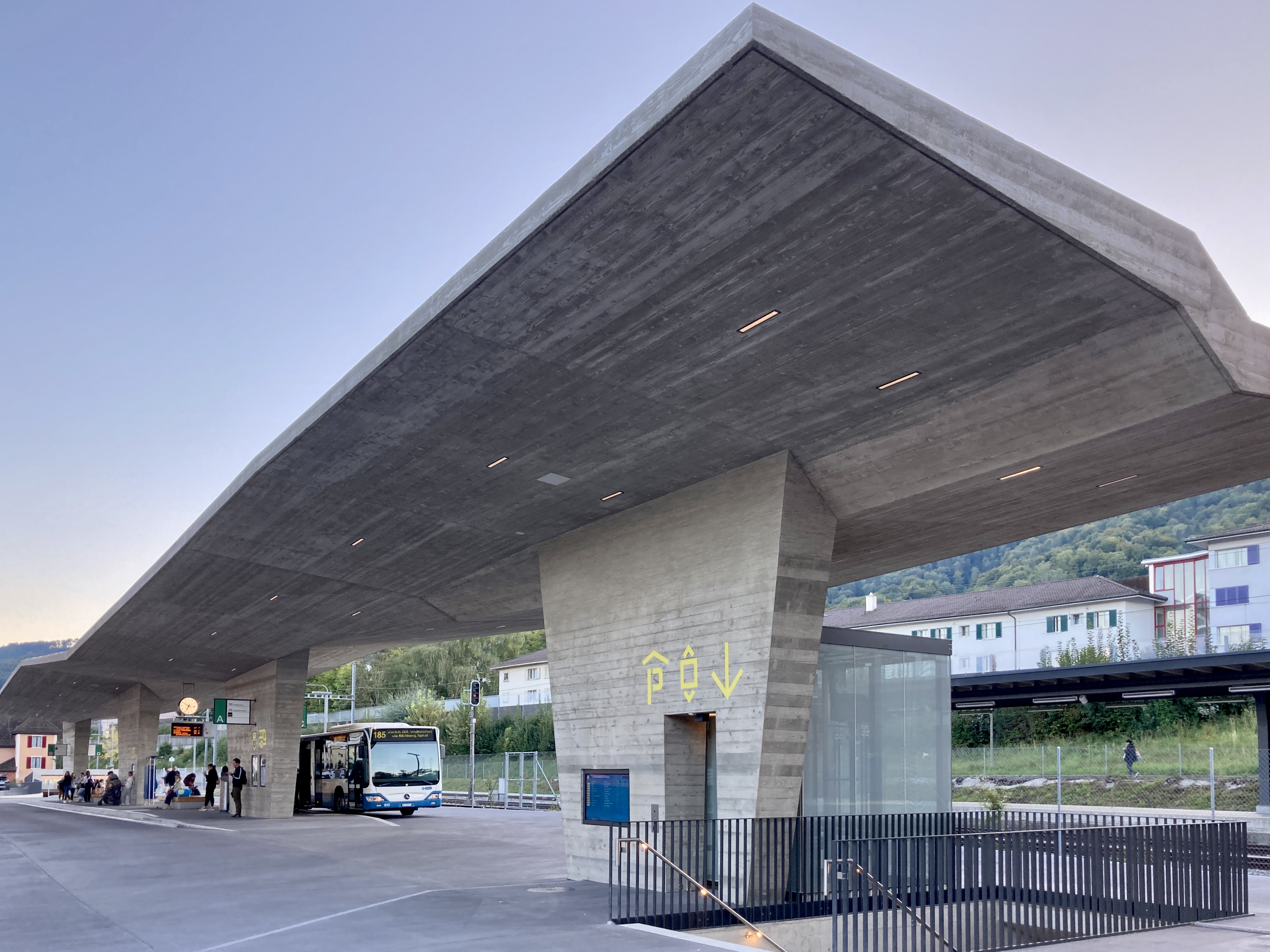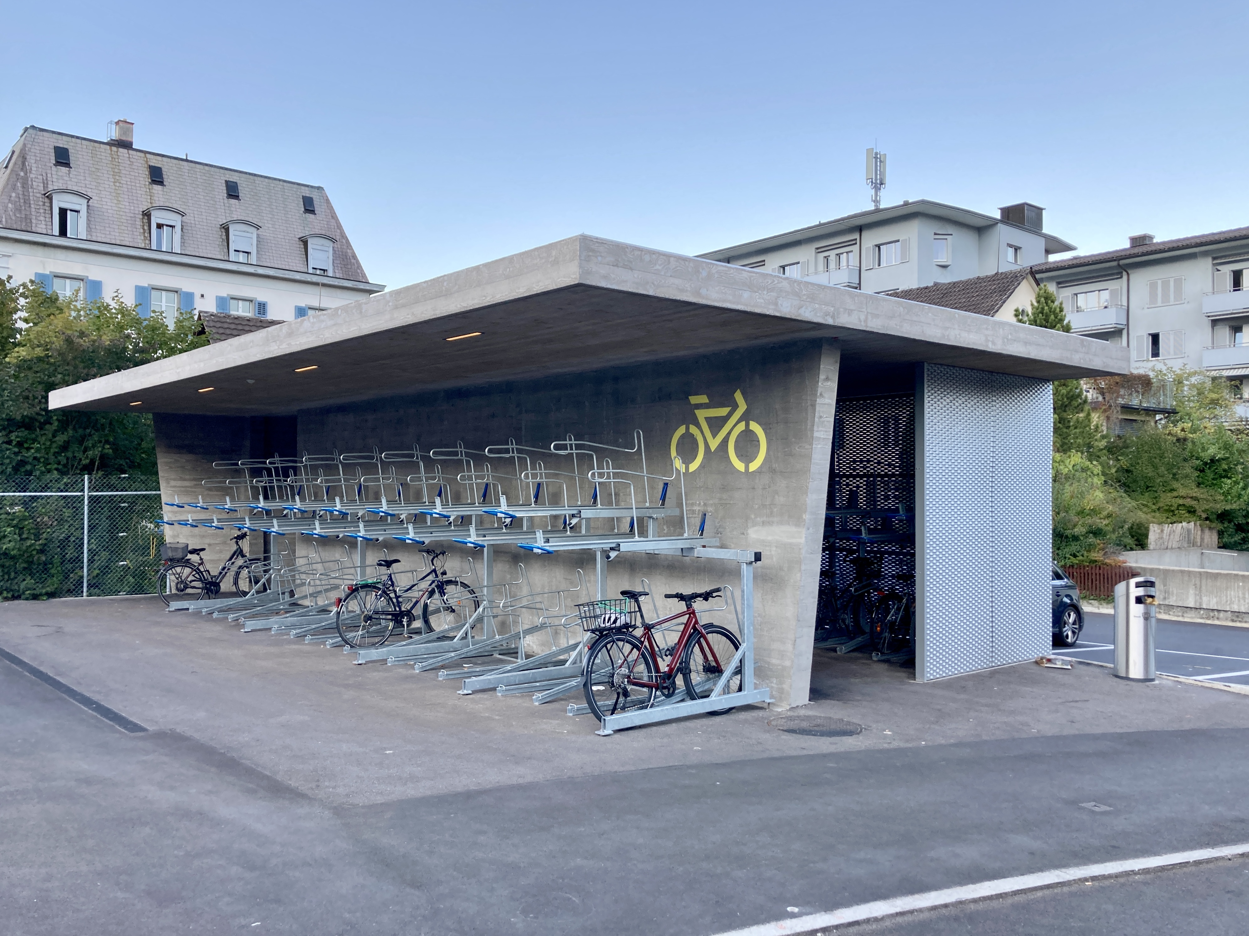 The concrete bus station and cycle park, as well as a payment building for car parking, were all built as part of a large scale reorganisation of transport facilities at Adliswil to make a new transport hub, completed in 2022.