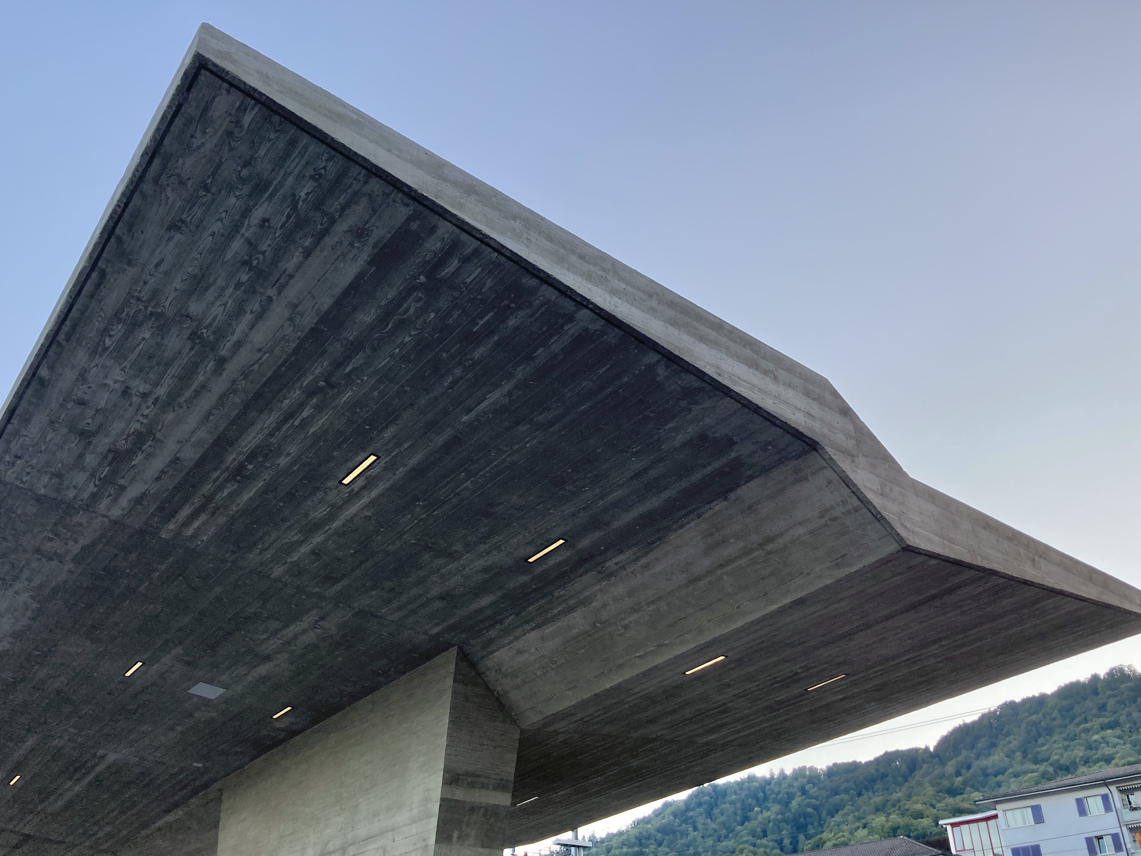 This bus station is a beautiful piece of engineering and architecture, which sits very comfortably in its local environment. The imprint of the wooden formwork used to cast the bus station’s concrete provides a visual link between the wooded hills which are the backdrop to Adliswil, and the more immediate built environment. The shape of the roof is intended as an evocation of the topography of the nearby Zimmerberg, and the hydroelectricty generated by the River Sihl which flows through Adliswil and parallels the railway for much of its length.