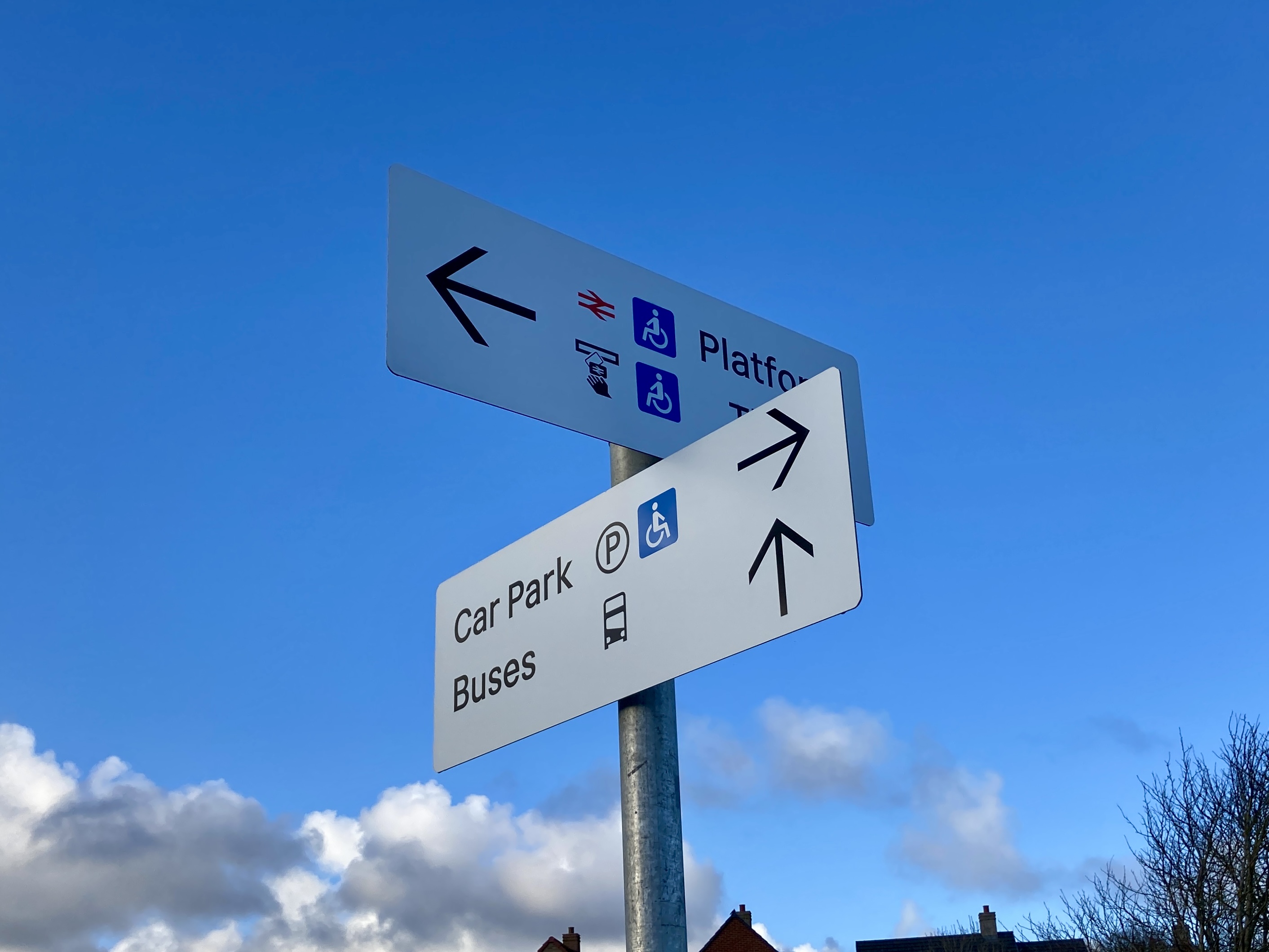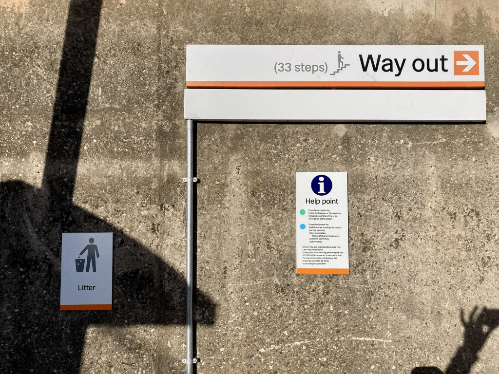To recap earlier articles, Network Rail’s 2021-onwards wayfinding standards are based around signs with a white background and black text, the same colour combination used by British Rail, and quite different from the blue signs with white text introduced by British Rail’s successor – and Network Rail’s predecessor – Railtrack. The typeface used on the Network Rail 2021 signage is the specially commissioned Rail Alphabet 2 by Margaret Calvert and Henrik Kubel, while the double arrow symbol mandated for use on them has been Rail Symbol 2 since late 2022.