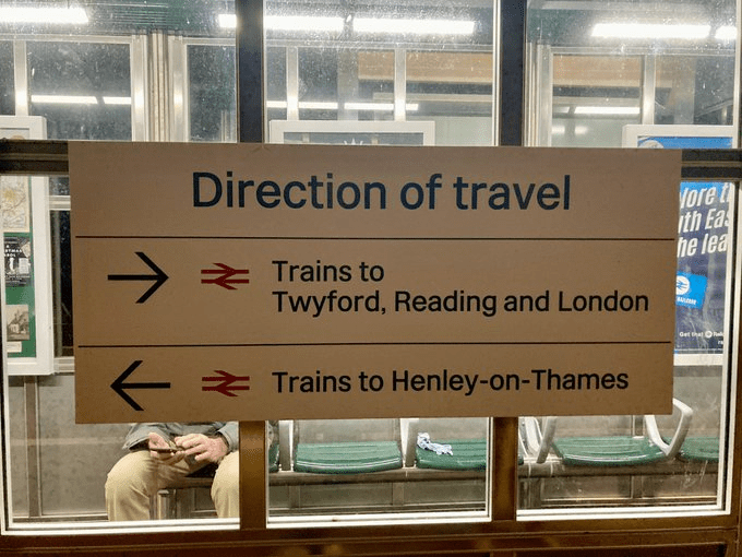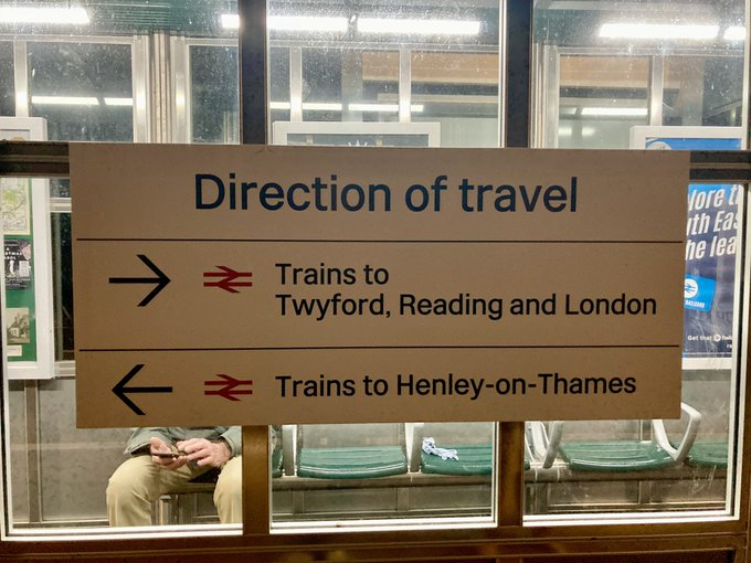 Using the double arrows to represent “train” presumably in reality follows on from the LU roundel being used for signage pointing towards the tube and is yet another example of the London-centric thinking of far too many industry managers and designers.