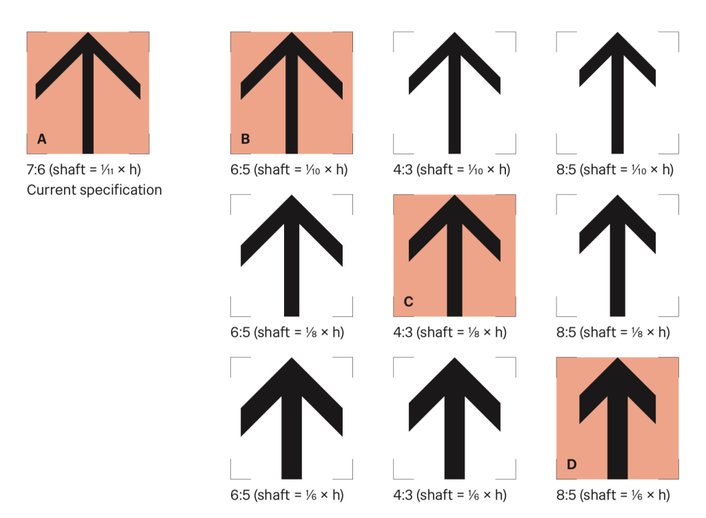 Job’s review proposed altering signage to be centred on the x-height of lettering (i.e. with equal space above and below lower-case letters without ascenders or descenders, such as x, e or a). This has been incorporated into version 3 of Wayfinding. Alongside this, the new version of the guidance requires the double arrow symbol to be centred on the x-height. Version 1 of Wayfinding had the symbol sized and centred on the cap-height, which made it look rather too small.