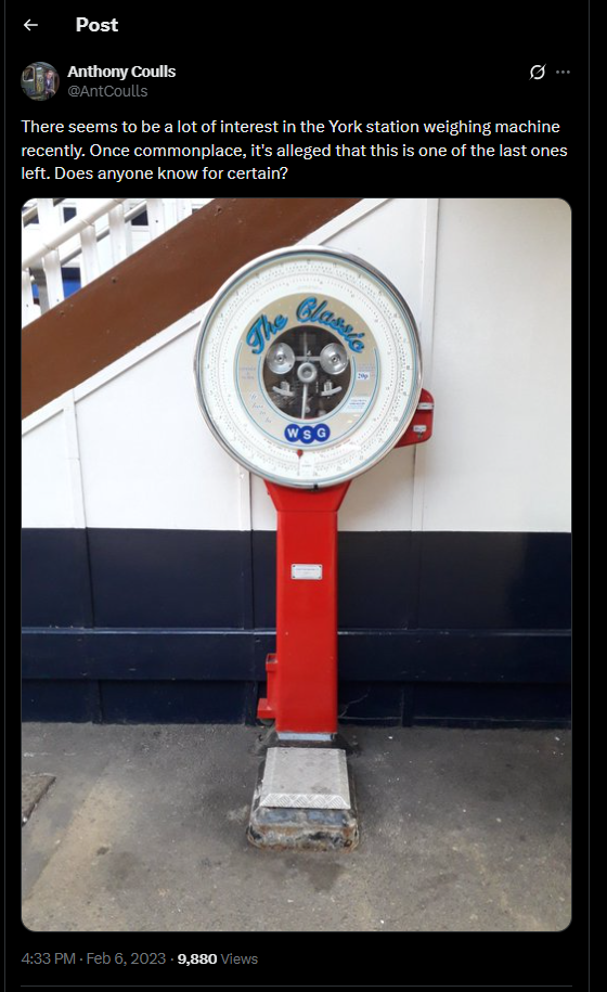 To return to York station’s platform 3 weighing machine mentioned earlier, a very good question was posed on Twitter a couple of years ago by National Railway Museum senior curator Anthony Coulls. No-one could definitively answer it, which was a rather good illustration of the lack of institutional knowledge about heritage artefacts at stations.