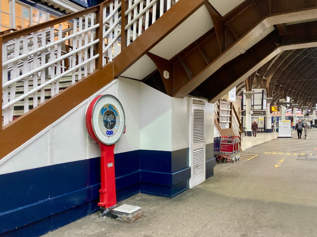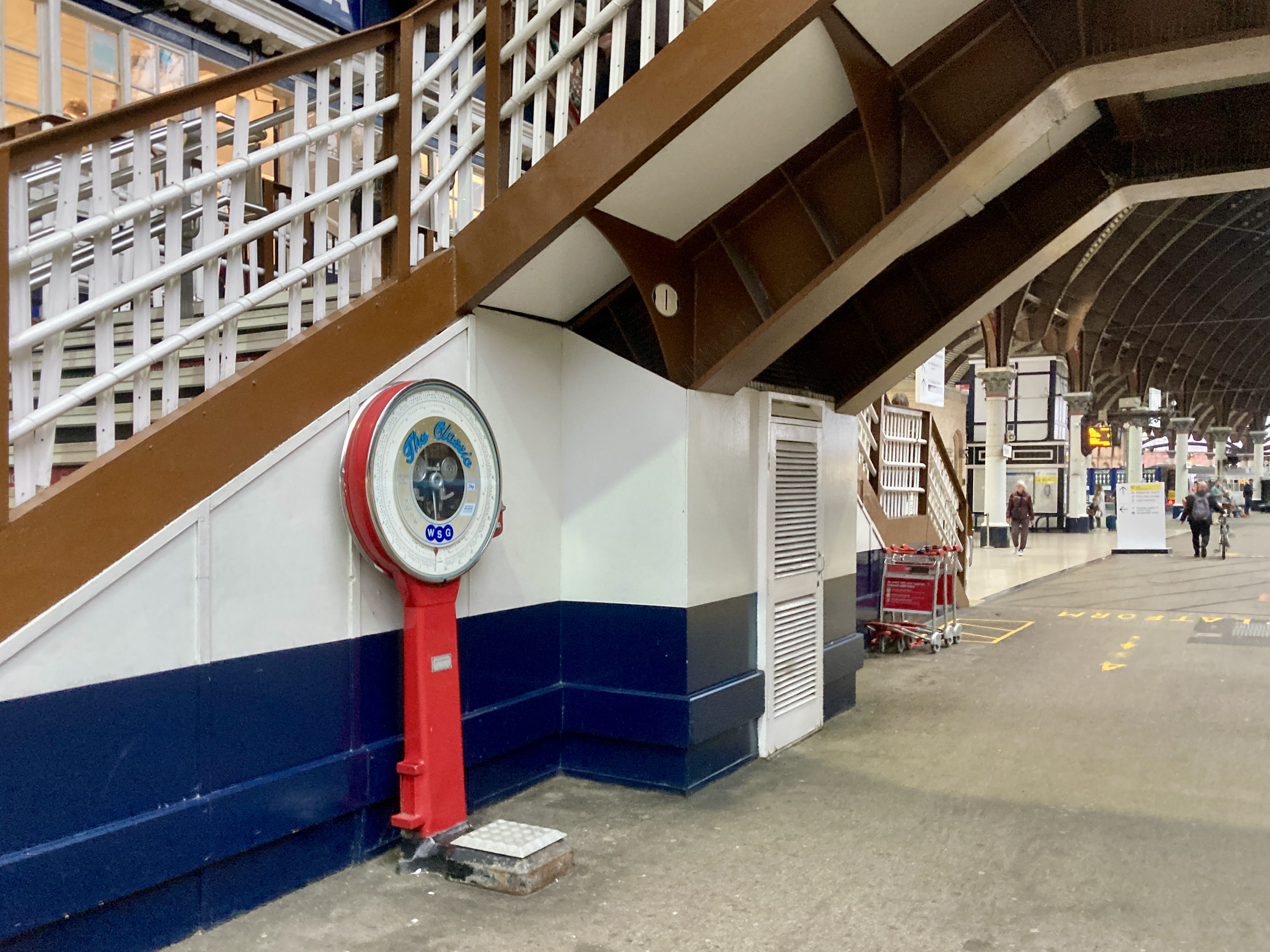 Listing of stations (by Historic England, Cadw or Historic Environment Scotland) affords some statutory protection to artefacts, especially the fixtures and fittings which are permanently attached to buildings. Despite that, it is surprisingly possible for contractors not to realise they are working at a listed station and accidentally remove/replace heritage artefacts in the process of maintenance, repair and modernisation. And where objects are not attached to the actual station – like (for instance) the weighing machine on platform 3 at York (of which more later) – no one seems sure if listing even covers them. Clearly, listing doesn’t and shouldn’t automatically protect chairs recently brought in to a station cafe, but at what point (if at all) are moveable objects that have been at the station for decades covered by the listing?