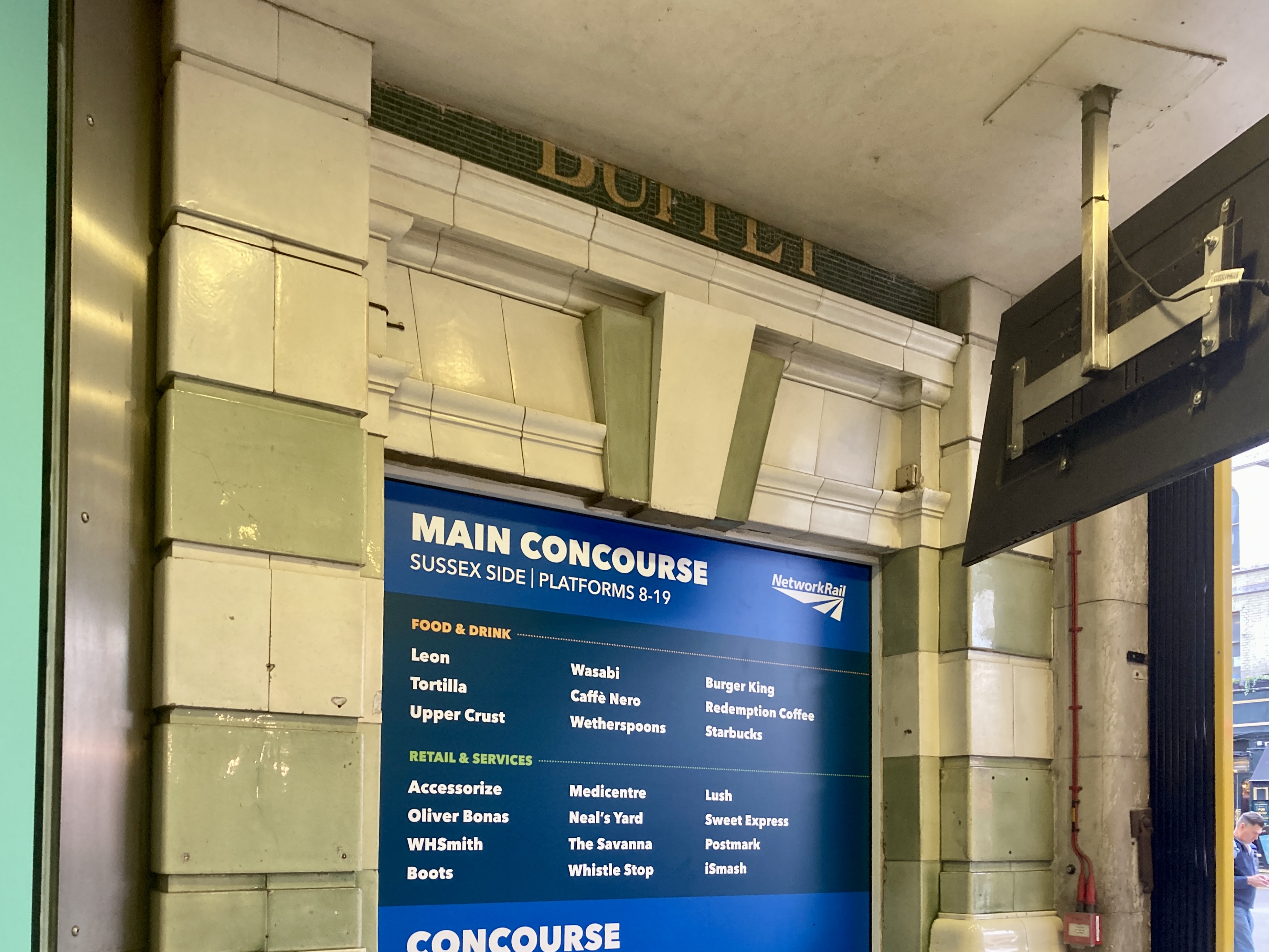 I’ve been noting examples of heritage artefacts at stations for quite a few years now, and have built up quite a large photographic collection of them. Occasionally I do talks on the subject and people seem interested and genuinely surprised at the variety of these objects and the stories they tell. Audiences are also gratifyingly shocked about the treatment of some heritage artefacts. My favourite go-to example is the terrible inserted ceiling at London Victoria that obscures all but the lower part of some fabulous London, Brighton & South Coast Railway mosaic signage.