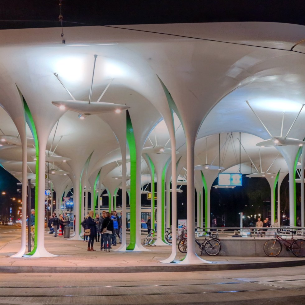 The Lime-green Pain Rays of Münchner Freiheit Tram Station (Münchner Freiheit tram/bus station, Munich, Germany)